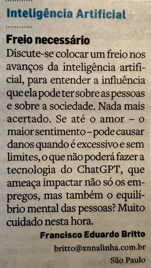 O tal ChatGPT está para a tecnologia assim como a construção civil está para a cidade de São Paulo: uma hora tem que parar e refletir. Ou ser parada e ser refletida. O que não dá mais é, indefinidamente, os interesses econômico-financeiros prevalecerem sobre os interesses de saúde mental e meio-ambiente, das pessoas e da cidade. O mundo tá no 220! Que tal baixar a voltagem de tudo? Se até o Elon Musk tá propondo isso (aqui), segue minha cartinha do Estadão impresso de ontem...